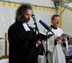 Nach dem Gottesdienst blieben die Menschen noch im Zelt zum Kaffeetrinken. Viele Fragen wurden laut. Wegen des aufkommenden Sturms konnten wir draußen keine Infotische hinstellen. Ein Pavillon war schon über das große Zelt hinweg geflogen. So gaben wir drinnen Auskunft so gut es ging. |