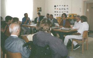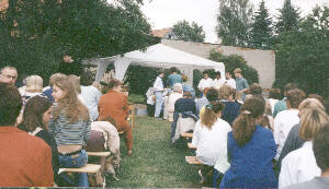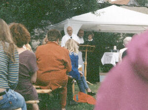 Leider scheuchte uns vor dem letzten Lied der Blista ein kräftiger Regenguß auf. Das Lied und vor allem die anschließende Podiumsdiskussion mußten in das gegenüber liegende Lutherhaus verlegt werden. Dort war aber alles vorbereitet. Selbst der Zauberer für die Kinder zog mit um.