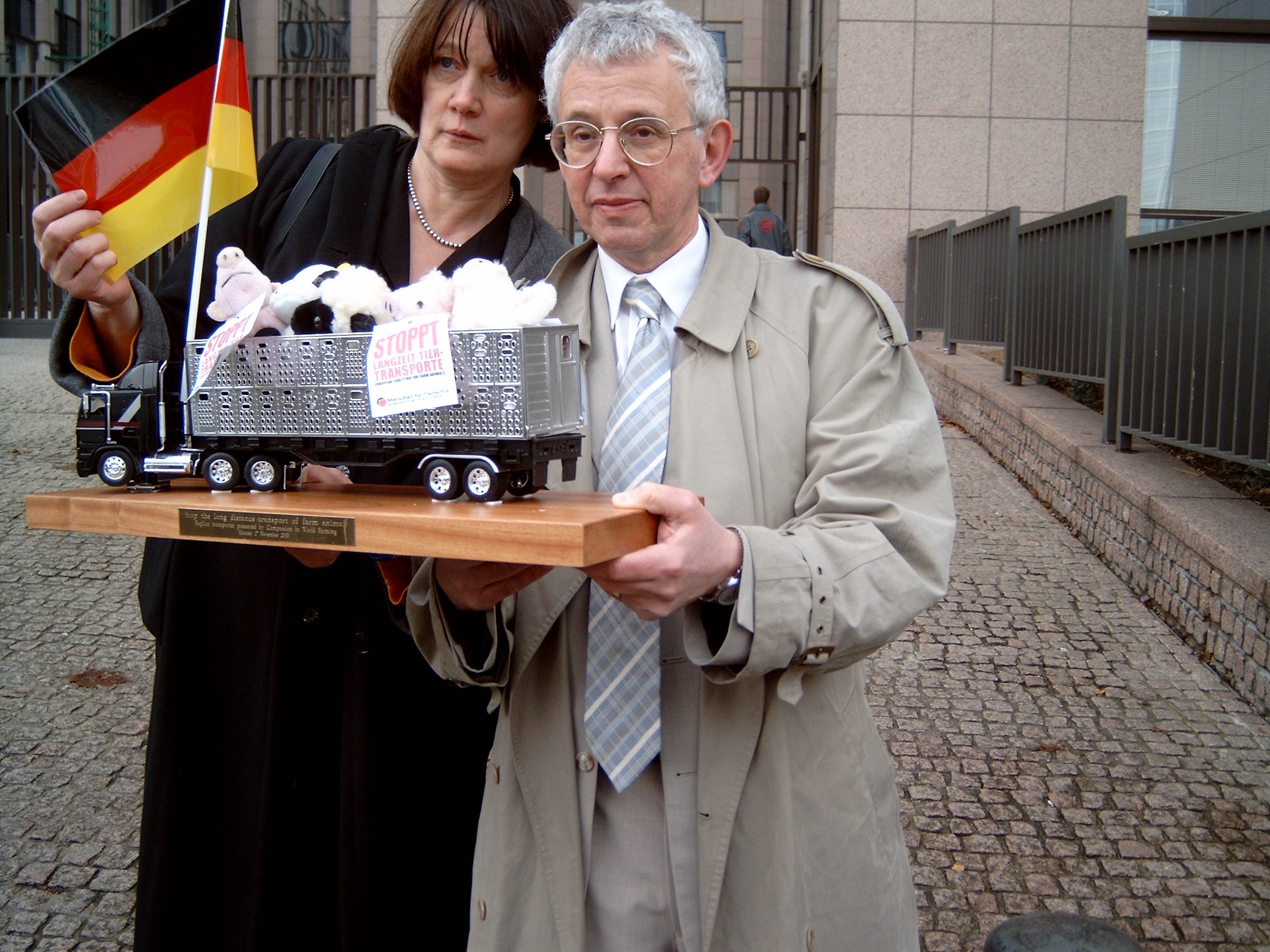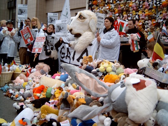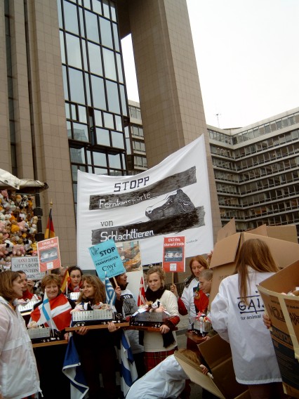 für Nutztiere fuhren wir nach Brüssel zur EU. Aus allen Ländern der EU machten sich Tierschützer ebenso auf. | Alle 15 EU-Agrarminister sollten einen Modell-Lastwagen mit Stofftieren überreicht bekommen. Die Stofftiere waren in ganz Europa in den letzten Monaten zum Zweck des Protestes gegen Ferntranporte von Schlachttieren gesammelt worden. |