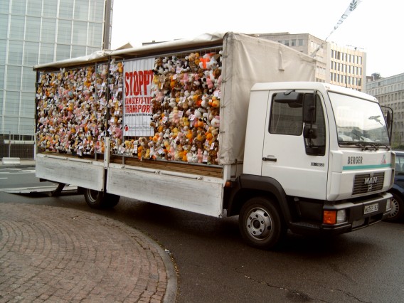 ![]() Protestierende vor dem Lastwagen | ![]() Stofftiere auf der Straße |