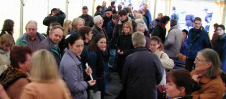 Im Zelt drängten sich die Menschen, es waren weit über 200 Leute. Einige mußten sogar vor dem Eingang stehen. |