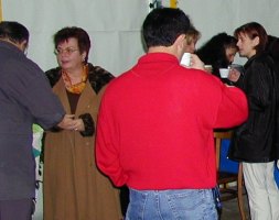 Nach dem Gottesdienst blieben die Menschen noch im Zelt zum Kaffeetrinken. Viele Fragen wurden laut. Wegen des aufkommenden Sturms konnten wir draußen keine Infotische hinstellen. Ein Pavillon war schon über das große Zelt hinweg geflogen. So gaben wir drinnen Auskunft so gut es ging. |